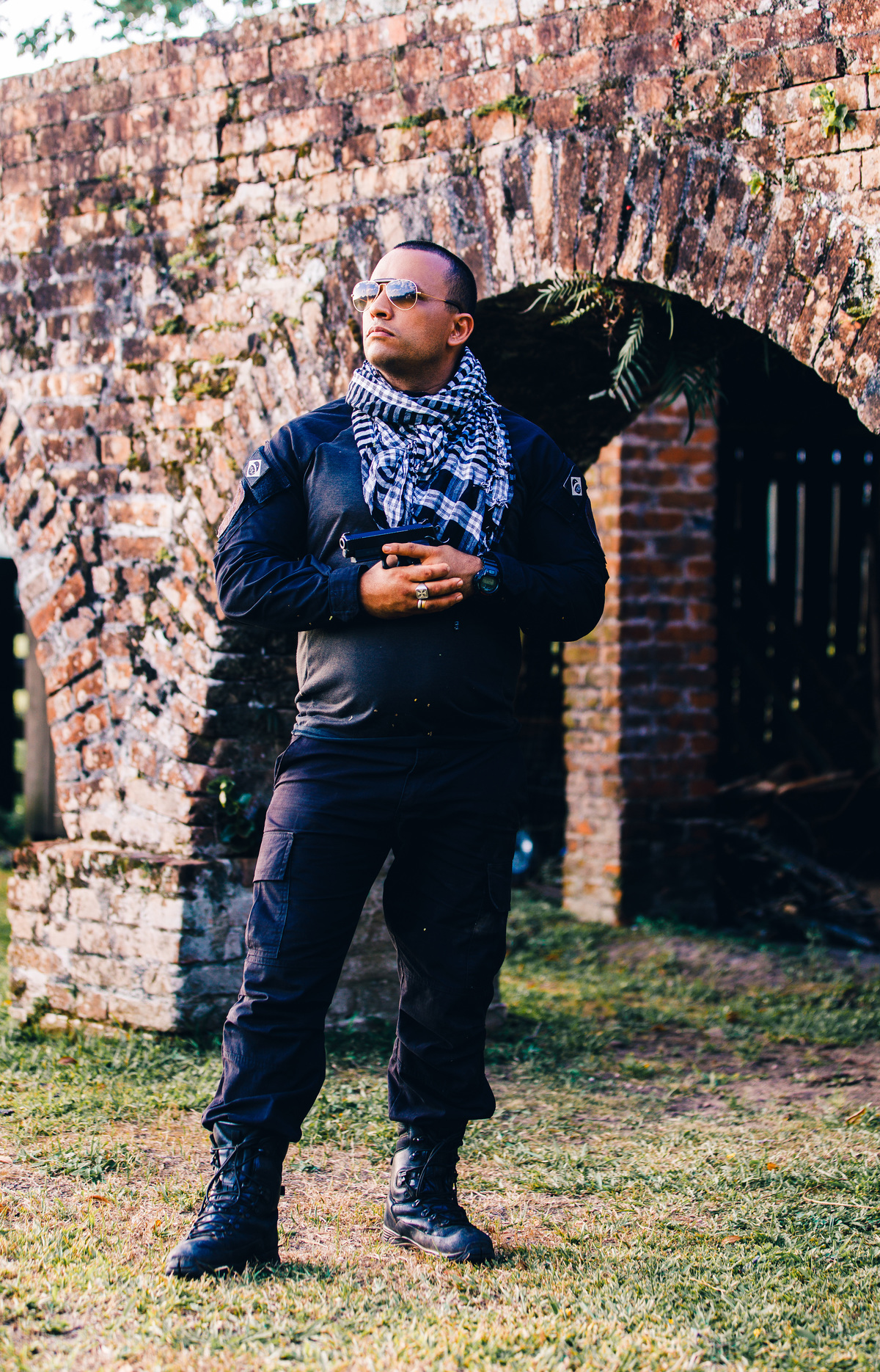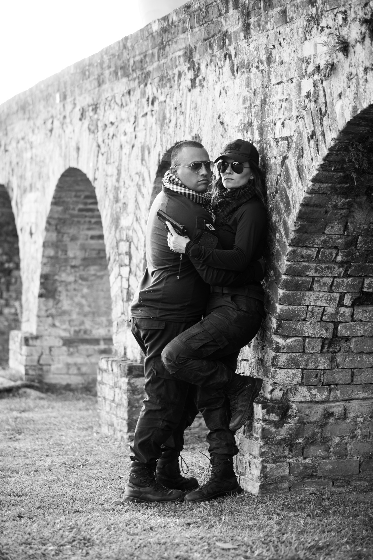 Vamos começar contando a história desse casal. Eles são policiais, e trabalham nesse ramo a muito tempo, por isso queriam fazer um ensaio fardados, e o resultado não poderia ter ficado mais incrível. O local escolhido super combinou com a temática das fotos. O Arqueduto é um empreendimento rústico, de pedra, onde antigamente passava água por cima, e hoje está para visitação.
